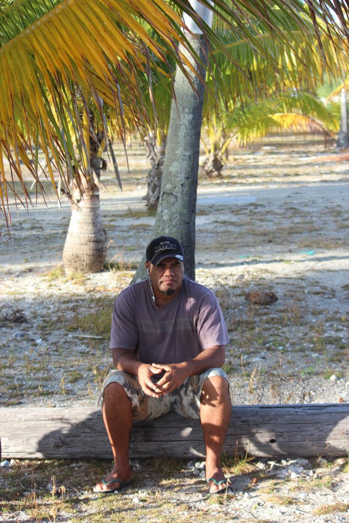 Comme beaucoup d’habitants des îles, Faatau travaille le coprah et le vend aux navires qui passent. Il obtient du cash ou l’échange selon les besoins du moment. Ce jour-là, il échangeait son coprah contre des sacs de ciment. Il dit que le travail du coprah est très dur. Il lui a fallu du temps et une pratique assidue pour le maîtriser. Plus d’un s’y essaient et abandonnent ce travail très physique.
