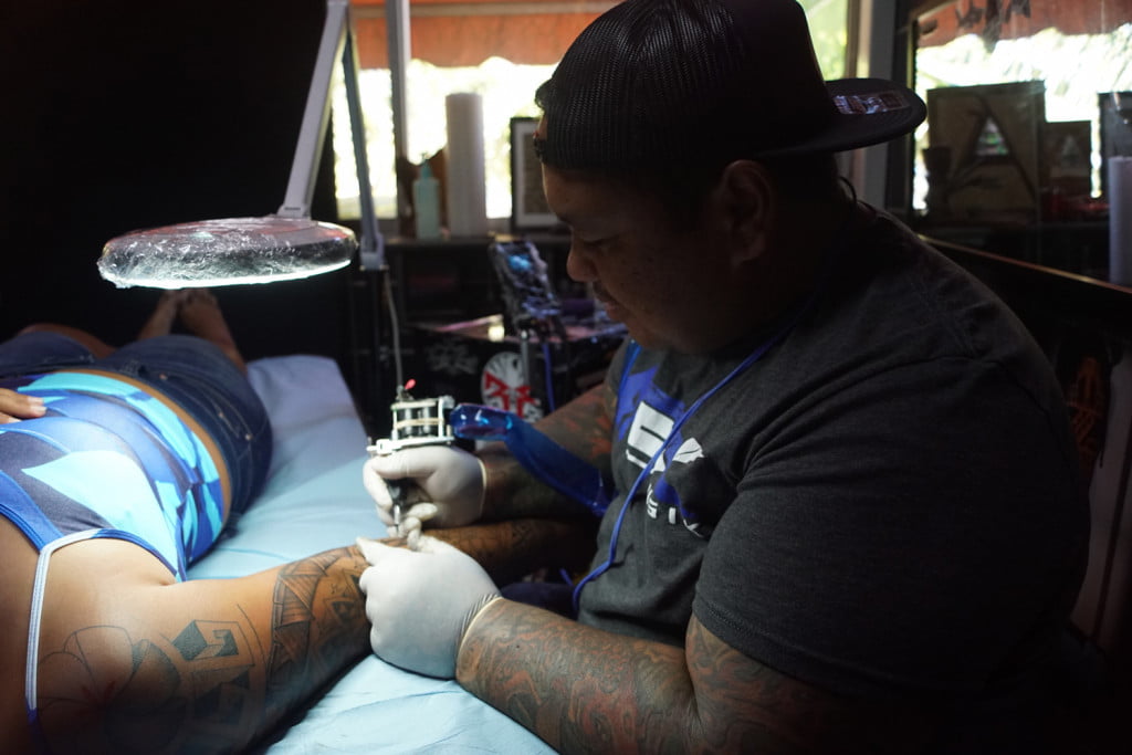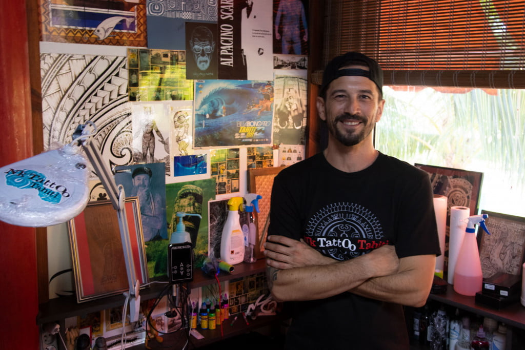 « Mon premier tattoo, c’était à Raiatea, avec un dermographe fait sur une base de rasoir à pile, il fallait être un peu bricoleur. On était loin des normes d’hygiène que l’on applique aujourd’hui. J’ai tatoué un pote, qui m’a accordé sa confiance, alors que j’étais inexpérimenté… Mais après quelques bières pour la motivation, on s’est lancé (rires). J’ai tout de suite adoré ce moment d’échange, de pouvoir rendre la confiance que l’on t’accorde. »