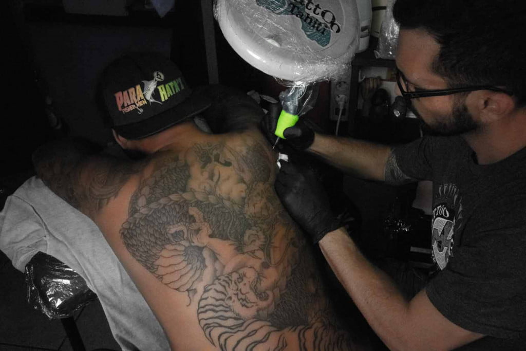 « Avec l’infographie, la rigueur d’un travail quotidien de création, j’ai appris à stimuler mon imagination. C’est pendant mes congés que j’ai eu l’opportunité de vivre une immersion en shop. Par la suite, les tatoueurs m’ont proposé de les rejoindre… J’ai tout plaqué pour devenir artiste tatoueur. »
