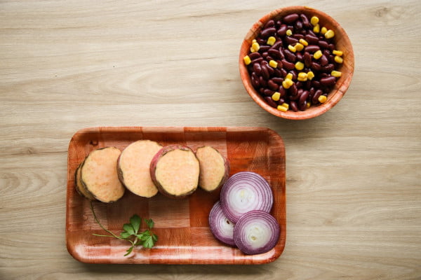 - Rincez et égouttez les haricots rouges et le maïs, et ajoutez la patate douce au reste des ingrédients dans la poêle. Laissez cuire 10 minutes