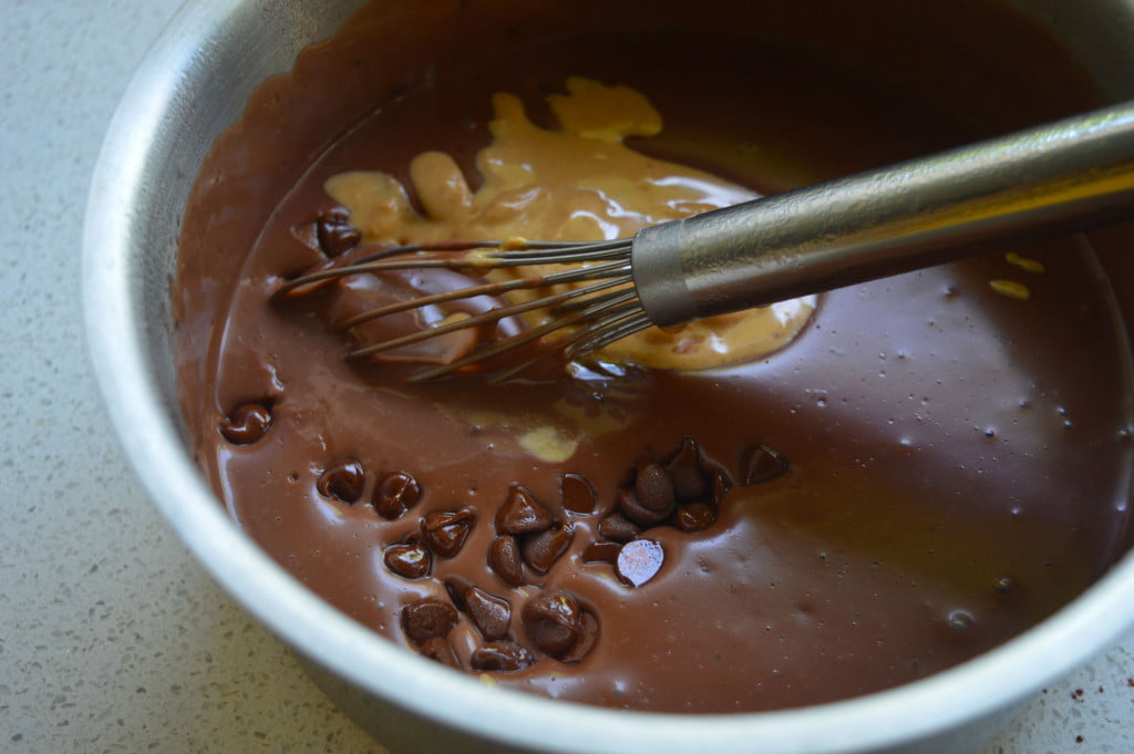 - Au bout de quelques minutes, le mélange aura pris une consistance plus épaisse. Ajouter à ce moment le chocolat et le beurre de cacahuète, en fouettant.