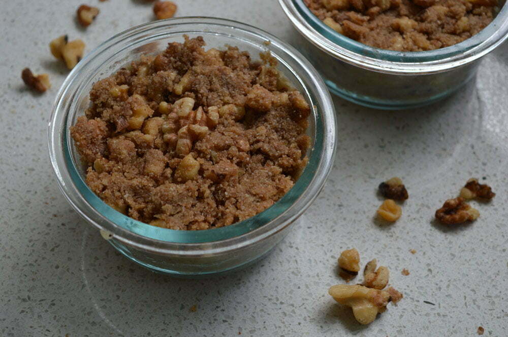 Huiler de petits ramequins. Y placer environ 3 c à soupe de purée de patate douce et recouvrir d’une bonne poignée de pâte à crumble aux noix.