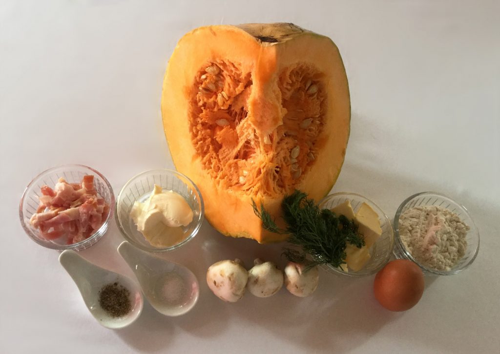 - Faire cuire le potiron au four pendant une heure à 180 °C. Retirer les pépins et la peau et couper en tout petit dés.