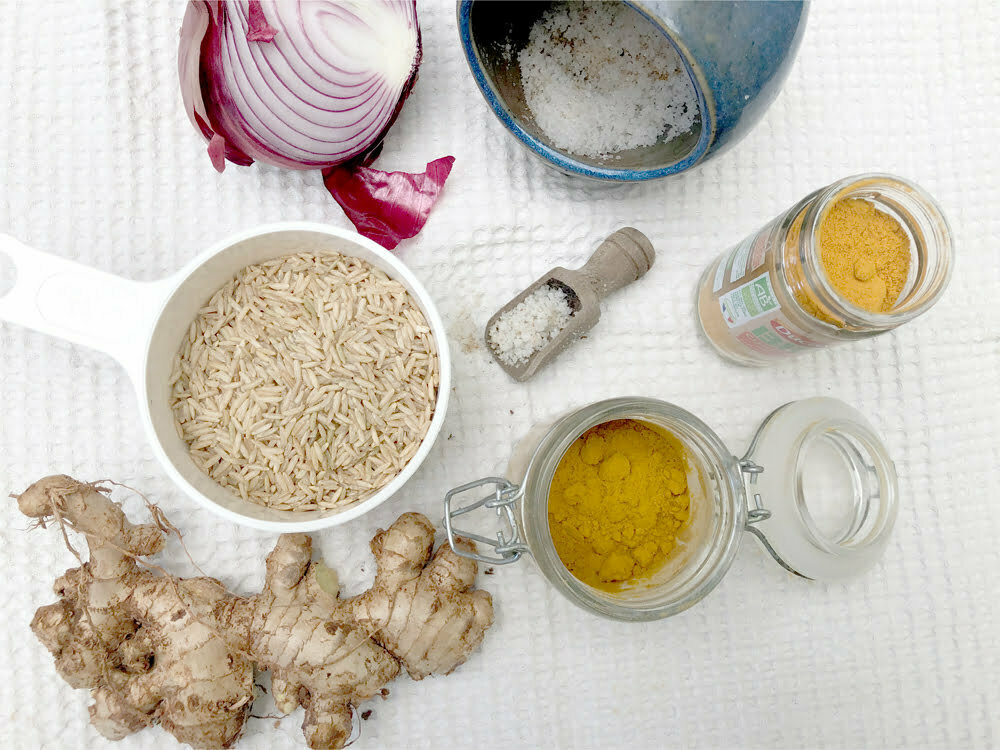 Faire revenir l’oignon et l’ail dans de l’huile d’olive. Ajouter le riz cuit.