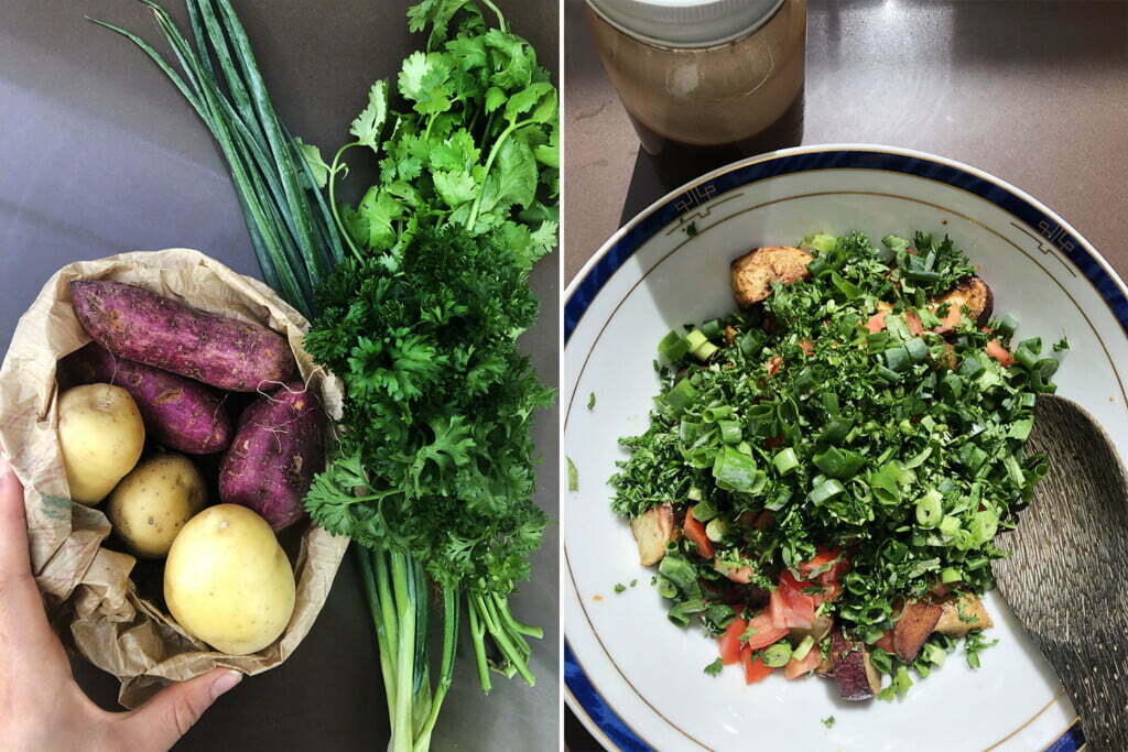 Recette : salade de patates douces rôties, herbes fraîches et feta