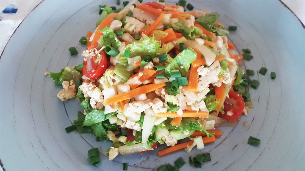 Disposez les feuilles de laitue ou salade dans une assiette creuse, incorporez les légumes et ajoutez le tofu avec l’assaisonnement.