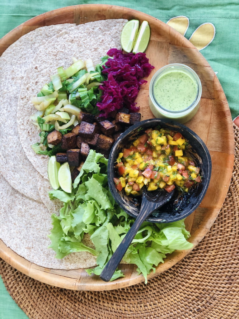 Servir les tortillas accompagnées de la protéine grillée, la sauce green, la salsa, le pota sauté, de la laitue, un quartier de citron pour chaque tacos et éventuellement du coleslaw de chou.
