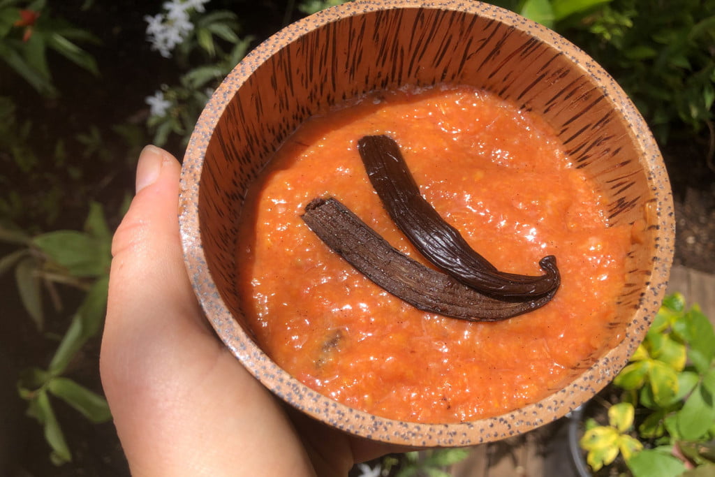 Chauffer la purée de goyave, le sucre et la vanille de Tahiti dans une petite casserole.