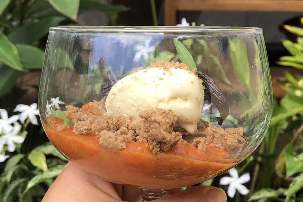 Au fond de chaque verrine, placer environ 2 cuillères à soupe de confiture de goyave. Ajouter une petite poignée de crumble, suivi d’une quenelle de glace.