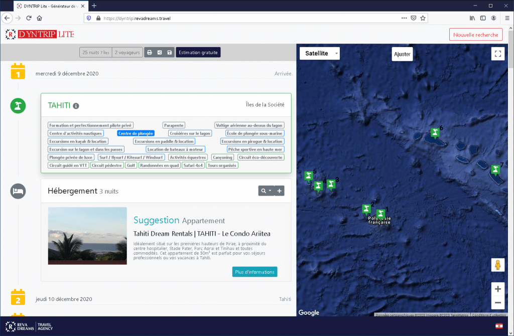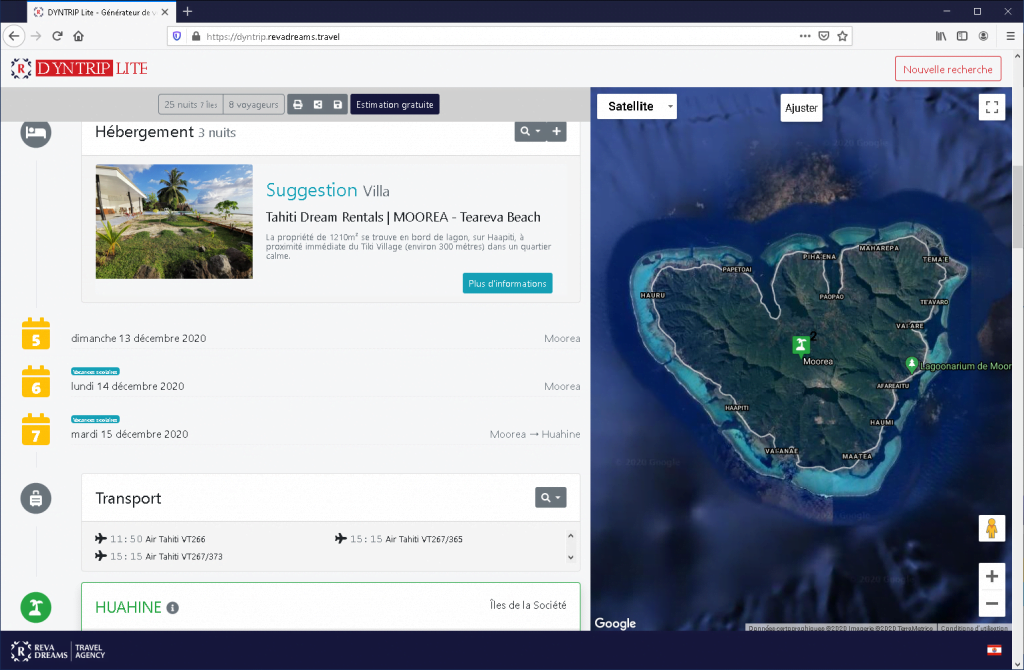 Pour ce qui concerne les hébergements, DYNTRIP puise dans la base de REVA DREAM RENTALS, mais également dans celles de AIRBNB et BOOKING.COM, en adaptant ses propositions aux îles, dates et disponibilités en temps réel.